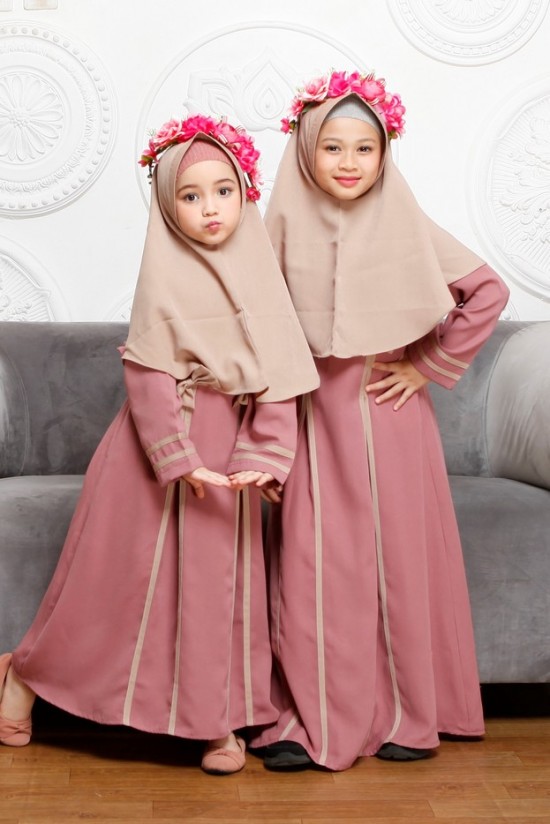NSAP 59, gamis muslim anak dari Nibras yang dilengkapi dengan hijab. Terbuat dari bahan Aurora, bahan yang halus, lembut, tebal, bertekstur bintik-bintik seperti crepe.