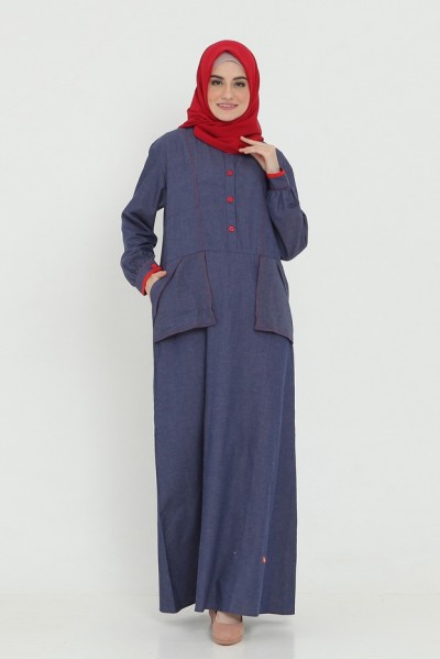 Selain gamis ini terlihat casual, bahan _oxford denim_ warna Navy dan Dusty Blue dengan sentuhan variasi stitching benang warna kontras memberikan kesan tegas. Bahan _oxford_ juga membuat gamis NB A35 terasa dingin apabila dipakai.