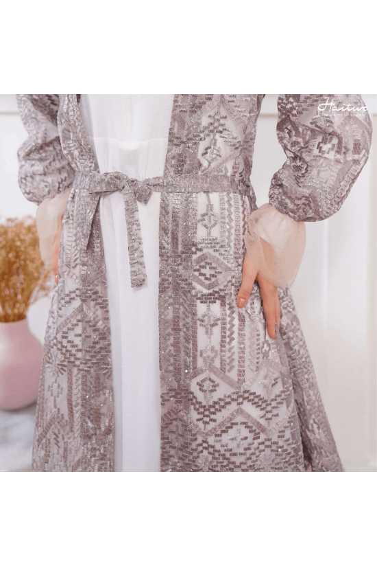 Embroidery Ethnic Tulle bertekstur seperti jaring dan ringan dengan aksen bordir khas Haitwo yang berkilap sehingga memberikan kesan yang mewah. Sedangkan Soft Tulle adalah bahan berbentuk jaring yang lebih halus dan lembut.